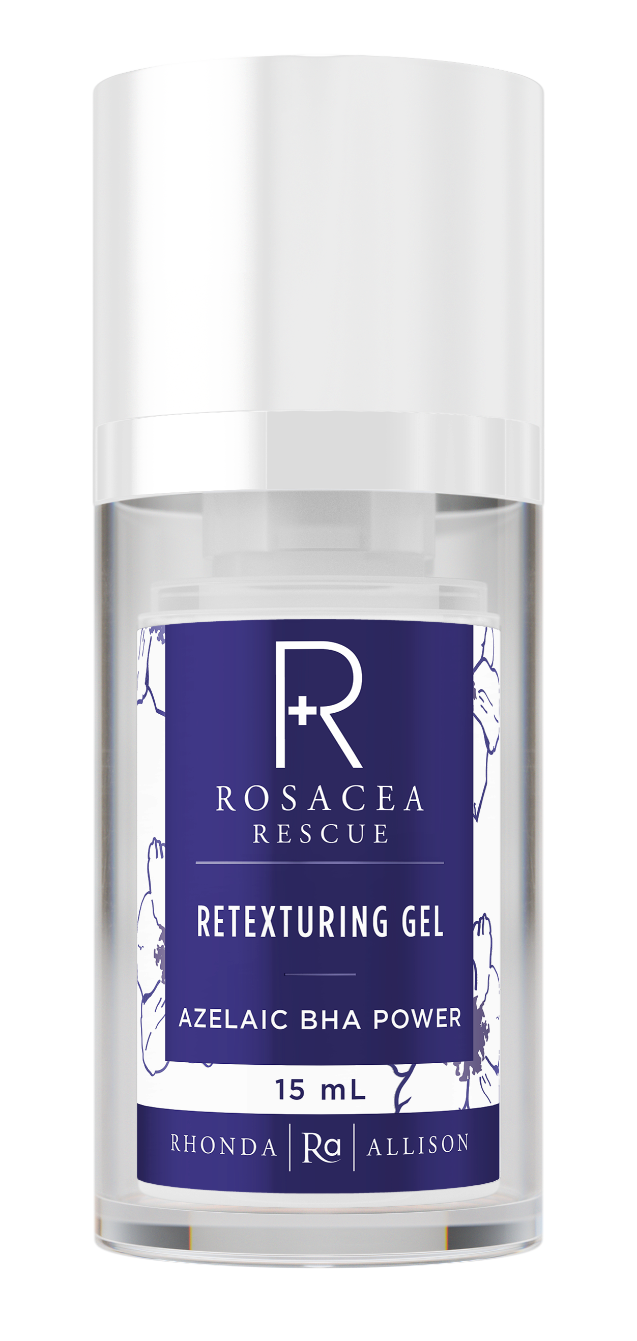 Potent serum for thicker rosacea texture and skin prone to blemishes, using salicylic acid and azelaic acid for antiseptic, exfoliation, and healing benefits.