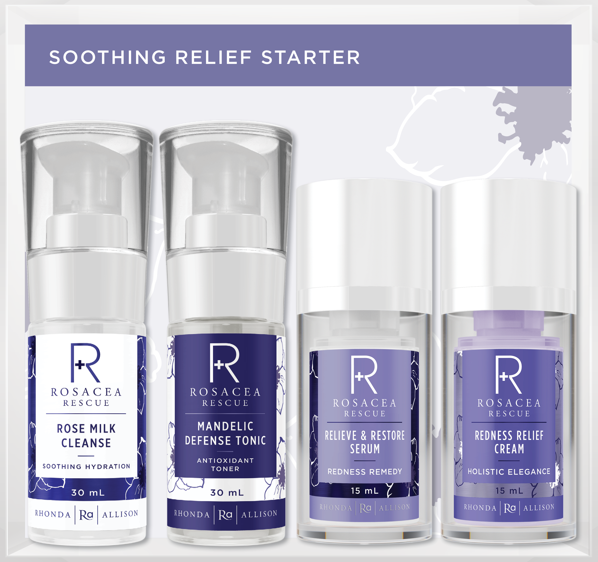 AM – Cleanse with Rose Milk Cleanse, remove with warm water and soft cloth, pat skin dry. Apply Mandelic Defense Tonic with a cotton round, let product absorb into skin. Apply 1-2 pumps of Relief & Restore Serum. Finish with 1-2 pumps Redness Relief Cream.